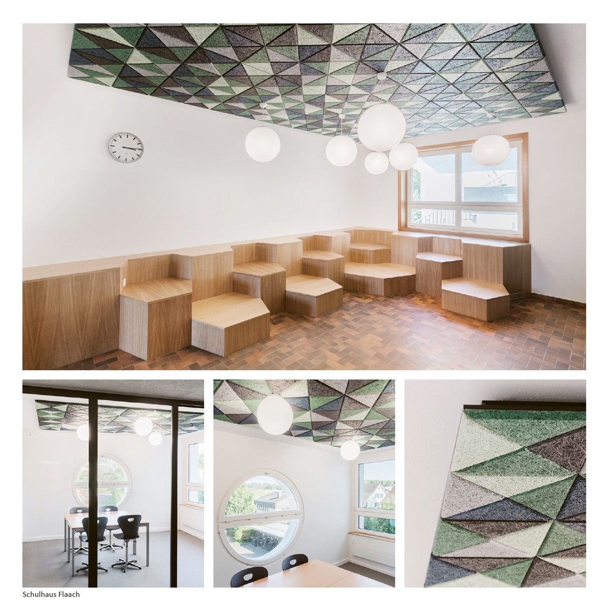 Realisiert haben wir die Decken mit Holzwolle-Leichtbauplatten. Ein umweltfreundliches und wiederverwertbares Material aus Holzwolle, Wasser und Zement, das viele Vorteile bietet: Es absorbiert Schall, reguliert Feuchtigkeit und speichert Wärme. Zudem ist es emissionsarm und feuerfest. Das macht Holzwolle-Leichtbauplatten überall dort zur perfekten Lösung, wo Schallemissionen reduziert werden sollen und ein gesundes Raumklima geschaffen werden soll. Für ein stimmiges und hochwertiges Raumgefühl haben wir die Wände im Schulhaus Flaach zusätzlich erkleidet und die bestehenden Oberflächen veredelt. Nun erstrahlen auch sie in neuem Glanz.